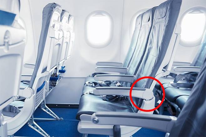 이 숨겨진 버튼은 어디에 있을까요? 통로 쪽 팔걸이의 안쪽, 팔걸이와 좌석이 접히는 부분을 더듬어보면 움푹 들어간 버튼을 찾을 수 있습니다. 이 버튼을 누르면서 팔걸이를 들어 올리면 좌석에 작은 '자유 공간'이 생깁니다. 간단하지만 쾌적한 비행을 위해 기억해 두면 좋을 꿀팁입니다.
