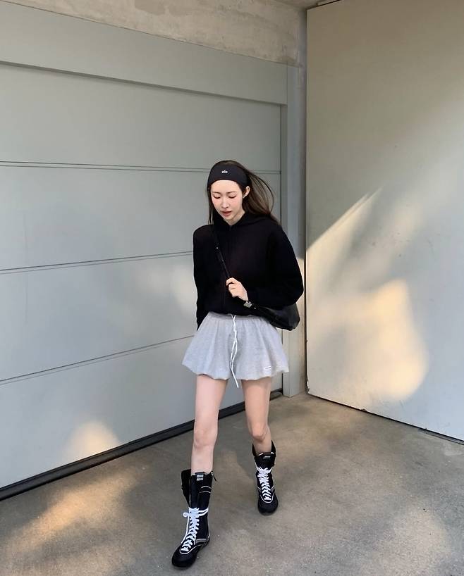 차정원은 블랙 후드 티셔츠에 회색 테니스 미니스커트를 매치해 편안하면서도 러블리한 분위기를 연출했습니다.