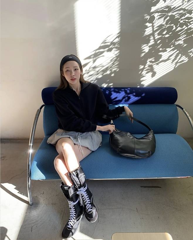 여기에 블랙 헤어밴드와 숄더백으로 스포티한 무드를 살리고, 롱 레이스업 부츠로 강렬한 포인트를 더해 감각적인 믹스매치를 완성했습니다.