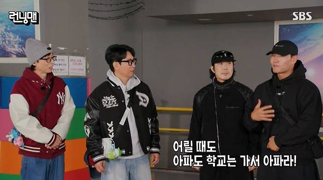 이에 김종국은 "제가 어제 어머니한테 연락해서 '런닝맨' 촬영을 어떻게 해야 할지 여쭤봤다. 어머니가 '그래도 가야 하지 않겠니'라고 하셨다"라며 "어릴 때도 아파도 학교는 가서 아프라고 하던 집이라"면서 아픈데도 촬영을 결심한 이유를 전했다.