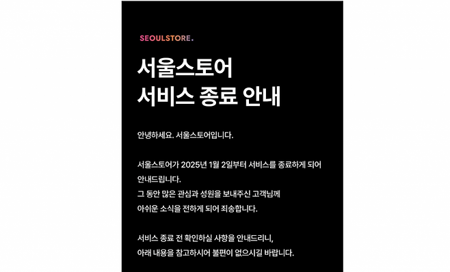 서울스토어는 "서울스토어가 2025년 1월2일부터 서비스를 종료한다"며 "마지막 주문 가능일은 다음 달 1일까지며, 주문 가능일까지 사용하지 않은 잔여 포인트는 브랜디(여성 패션 플랫폼), 하이브(남성 패션 플랫폼)에서 사용할 수 있다"고 밝혔다.