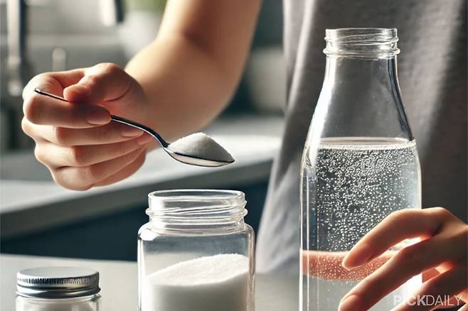 굵은 소금을 이용해도 좋다. 소금은 냄새를 제거하고 살균하는 효과가 있는 대표적인 천연 식품이다. 굵은 소금 한 스푼을 병 안쪽에 넣고, 물을 소량 넣어 준뒤 뚜껑을 닫아준다. 그다음 힘차게 흔들어주면 된다. 굵은 소금이 연마제 역할을 하며, 물때를 제거하는데 도움을준다.