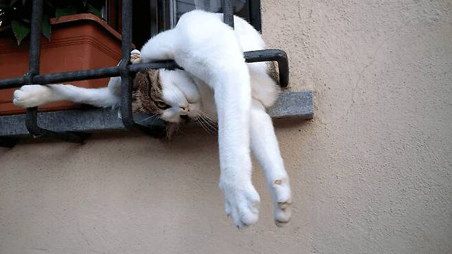 # 문지방에서 자면 안되는데,,, '大자'로 철푸덕 냥이