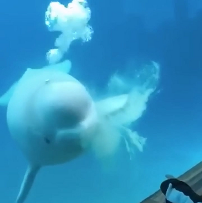 벨루가의 입에서 퍼져 나오는 하얀색 물체.