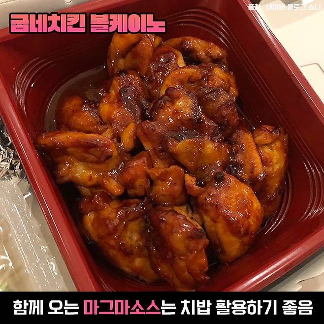 함께 오는 마그마 소스 덕분에 양념 걱정 필요 없는 볼케이노! 특히나 굽네는 오븐에 구워 기름기가 적어 담백하게 먹을 수 있는 게 특징이죠^^ 밥 준비하고 치킨 조각내서 넣은 후 참기름과 마그마 소스를 함께 비벼주면 치밥 완성!