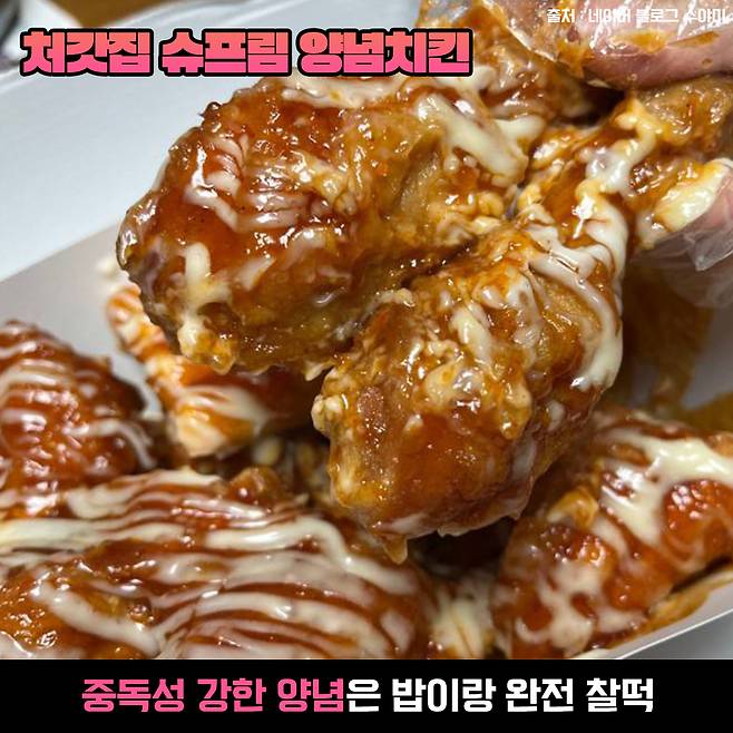 뜨~끈한 밥에 슈프림양념치킨을 한 조각 탁 올려놓고 먹으면 그 맛이 계속 생각나는 치밥 조합입니다.