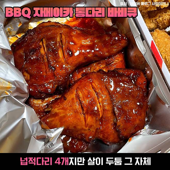 큼지막한 통다리 4개가 들어있는 바비큐 치킨이에요~ 일반 닭 다리랑 다르게 통다리라 그런지 크기도 크고 자메이카 통다리의 특유한 매콤한 양념 향을 맡게 된다면 바로 입으로 직행할 수밖에 없게 됩니다ㅋ.ㅋ 살짝 그을려져 있어서 불 향도 나고 화려한 맛을 자랑하는 치킨이에요.