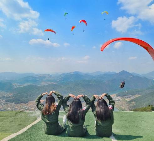 단양 양방산에는 다양한 패러글라이딩 업체가 있지만 그 중 '카페 산'은 패러글라이딩 활공장이 있어 뻥 뚫리는 전망과 다양한 포토존에서 사진을 남기기 좋아 추천드립니다.