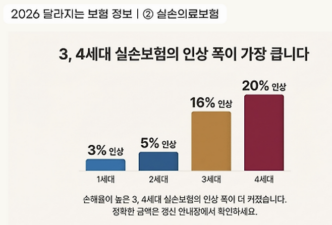 신규 세대의 배신: 비교적 최근에 가입한 3세대(16%)와 4세대(20%)의 인상률이 압도적입니다. 저렴한 보험료를 무기로 가입을 유도했던 4세대 실손이 오히려 가장 가파르게 오르며 가계 고정비 부담을 키우고 있습니다.