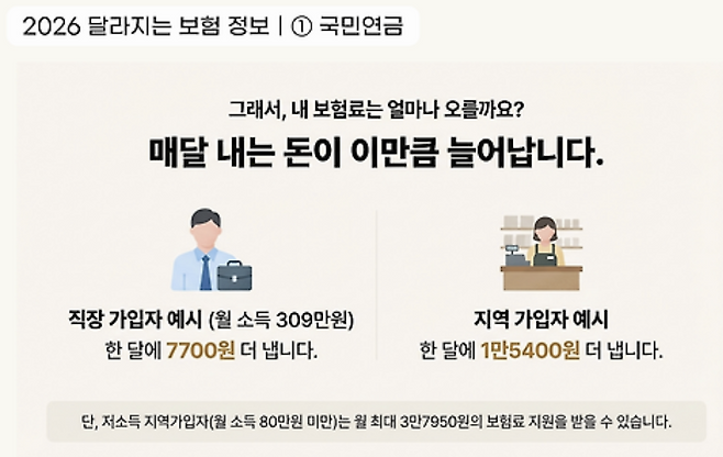 직장인 체감 변화: 월 소득 309만 원인 직장인은 이달부터 매달 7,700원을 더 냅니다. 회사가 절반을 부담함에도 불구하고 연간 약 9만 원 이상의 가처분 소득이 줄어드는 셈입니다.