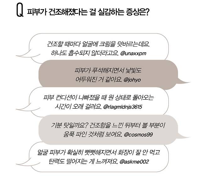 DOCTOR’S TIP 아무리 좋은 제품을 많이 발라도 계속되는 건조함은 이미 피부 코어 구조가 무너졌다는 신호. 장벽이 무너져 손상된 피부라면 인위적인 방법으로 수분을 공급하기보다는 피부 본연이 가진 수분 공급 시스템에 가까운 방법을 시도하는 게 좋다. 피부 수분을 끌어당길 수 있는 천연 보습 인자와 휴멕턴트 성분과 피부 구조를 튼튼하게 해줄 히알루론산, 판테놀 성분으로 아쿠아포린 시스템 개선에 힘을 쏟을 때다.