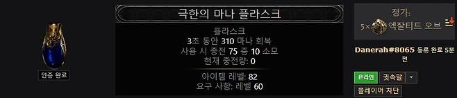 극한의 마나 플라스크도 인기가 많다. 낮은 마나 상태일때 회복 95%이상 증폭이 거래가 잘되는 필수 옵션인데, 이 옵션을 챙기기 위해 극한의 마나 플라스크로 제작 중이다. 균열 반지도 제작에 쓰이며, 사파이어 반지는 고유템 꿈의 조각을 만들기 위한 재료템이다. 별의 목걸이는 물론 무거운 허리띠도 고유템으로 만들기 위한 재료라서 흰색 아이템이 보이면 창고에 보관하자. 엑잘이 필요하면 직접 판매를, 아니면 직접 제작해서 아이템을 만들어서 대박을 노리자.