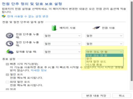 여기서 덮개를 닫을 때 → 아무것도 안 함을 클릭하고 저장하면 노트북을 닫은 상태로도 듀얼 모니터를 사용할 수 있습니다.