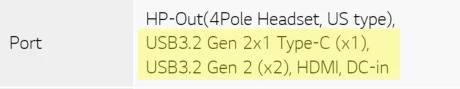 LG 노트북 16UD70R-GX56K로 예를 들어 설명드리면, HDMI 포트 하나 C 타입 포트 하나, A 타입 포트 2개가 있습니다.