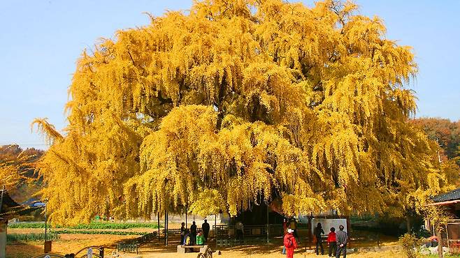 이름하여 ‘장수동은행나무’. 단풍철이면 수많은 은행잎들이 황금빛 물결을 이루며, 마치 시간을 멈춰놓은 듯한 풍경을 만들어냅니다.