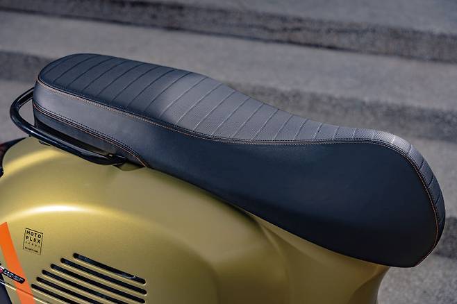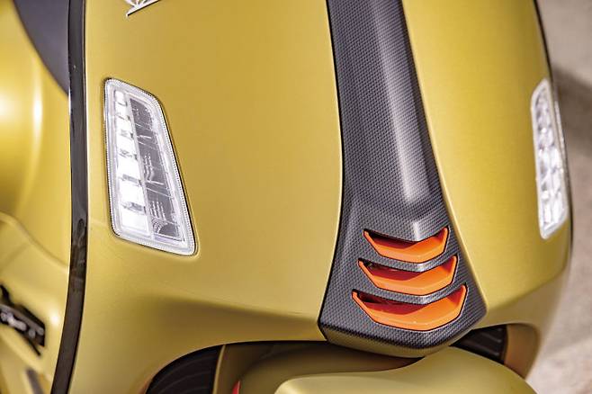 새로운 GTS 슈퍼 스포츠 125는 기존 GTS가 갖고 있던 실루엣과 분위기가 거의 동일하다. 하지만, 고유의 느낌을 그대로 지니면서도 차량 곳곳의 디테일을 다듬어 전체적인 완성도를 높였다. 가장 먼저, 고급스러운 무광 올리브 페인팅과 절묘하게 어울리는 프런트 타이가 눈에 띈다. 기존 모델과 동일한 듯 보이지만 약간의 디자인 변화로 더 날렵하고 깔끔한 분위기를 연출한다. 차량의 포인트 라인으로 적용된 오렌지 컬러를 통기구 안쪽에 더한 센스도 돋보인다.