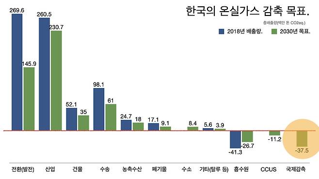 한국 정부가 2030년까지 ‘국제 감축’으로 줄이겠다고 약속한 목표가 3750만 톤이다.
