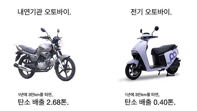 영업용 오토바이가 하루 100km를 주행한다고 치면 휘발유 오토바이는 3.21톤의 이산화탄소를 배출하는데 전기 오토바이는 0.49톤 밖에 안 된다.