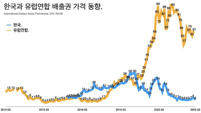 게다가 배출권 가격도 낮다. 한국의 배출권 가격은 KAU24 기준으로 톤당 9000원이다(3월14일 기준). 톤당 70유로 수준인 유럽연합과 비교하면 10분의 1 수준이다.
