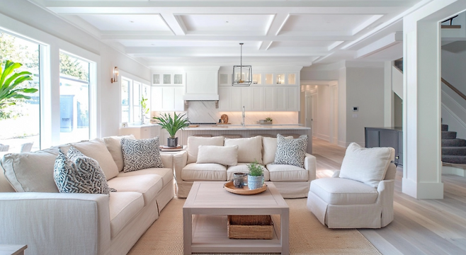 화이트와 연그레이는 거실을 가장 넓고 환하게 보이게 해주는 조합입니다. 벽과 천장은 화이트로 마감하고, 바닥은 연그레이 톤으로 선택하면 자연광이 반사되면서 더 넓은 공간감을 연출할 수 있죠.