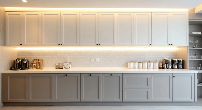 상부장은 화이트, 하부장은 그레이로 컬러를 나누면 시각적인 안정감을 줄 수 있습니다. 특히 무광 그레이는 오염이 눈에 잘 띄지 않아 실용적입니다.