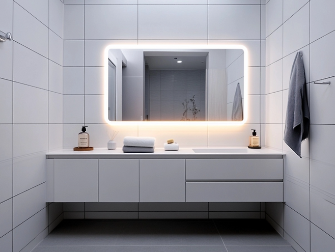 수납장이나 거울장은 무광 화이트로 통일하고, 거울 주변 간접 조명을 설치하면 호텔 같은 분위기도 연출됩니다. 작은 디퓨저나 식물을 두면 습도 조절에도 도움을 주며, 욕실에 생기를 불어넣을 수 있습니다.