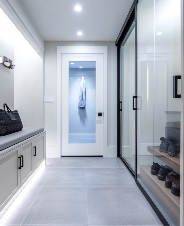 중문은 반투명 유리가 들어간 그레이 프레임으로 선택해 개방감을 주고, 센서 간접 조명을 설치하면 퇴근 후 집에 들어올 때 따뜻한 환영의 느낌을 받을 수 있습니다. 불필요한 물건은 최소화해 깔끔하고 세련된 분위기를 유지하세요.