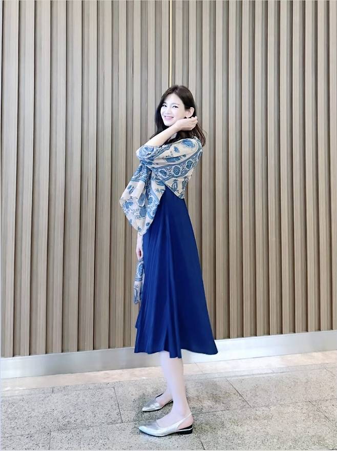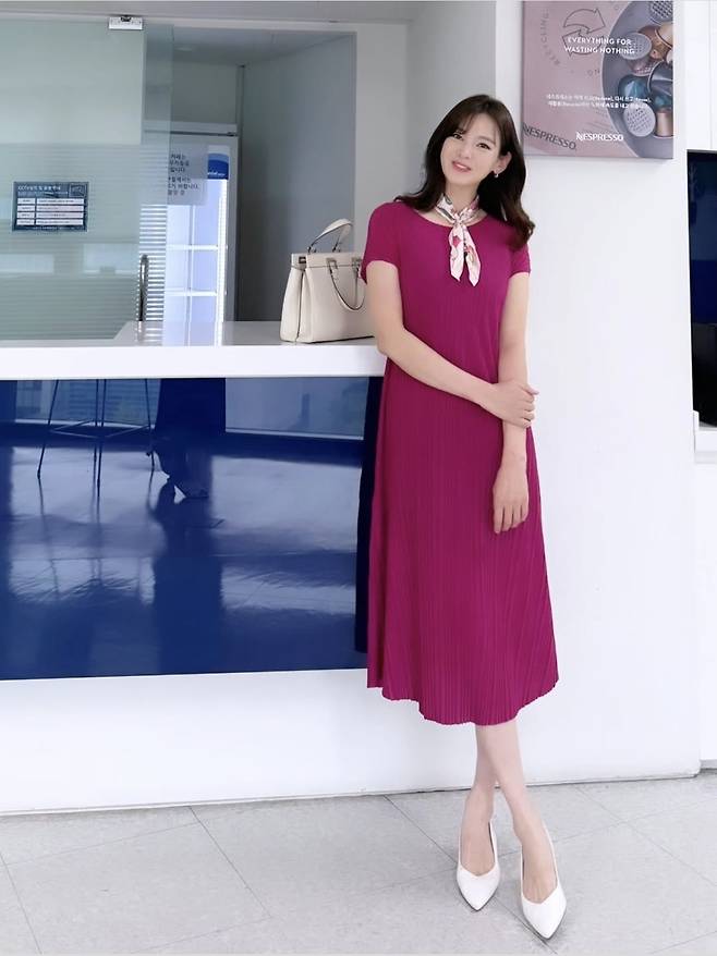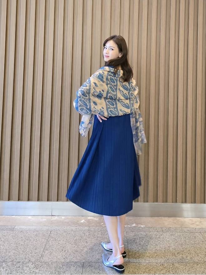 여기에 크림색 토트백과 화이트 슬링백 힐로 여성스러운 실루엣을 강조했으며, 블루 플리츠 원피스와 아이보리 패턴 숄더로 우아함까지 잡았습니다.