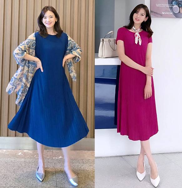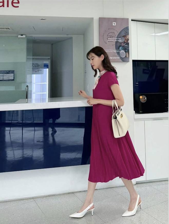 플랫 슈즈와 힐을 자연스럽게 매치하며 포멀함과 편안함을 모두 담은 스타일링으로 ‘워킹맘 워너비룩’의 정석을 보여줬고, 플리츠 특유의 고급스러운 실루엣이 정가은의 기품 있는 미소와 조화를 이루며 품격 있는 데일리룩의 진수를 증명했습니다.