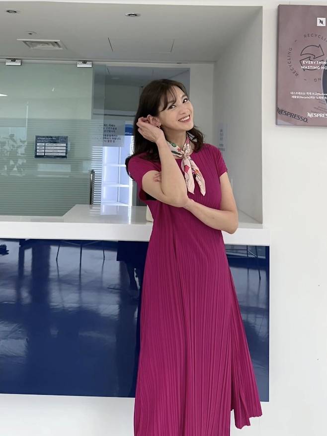 핫핑크 컬러 원피스에 페미닌 한 스카프를 더해 세련된 포인트룩을 뽐냈습니다.