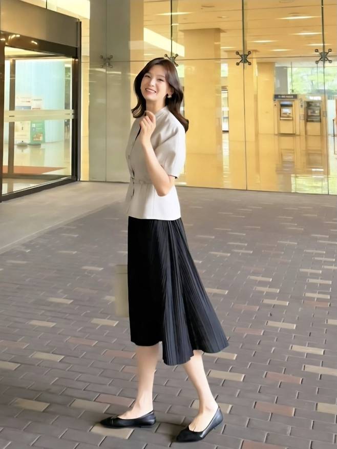 정가은은 그레이 재킷에 블랙 플리츠스커트로 단정한 오피스룩을 연출하며 심플하면서도 품격 있는 무드를 완성했습니다.