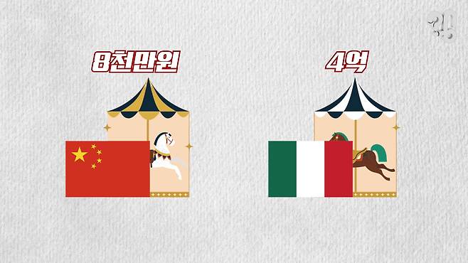 정품 카피를 많이 한 거지. 메머드급 (놀이공원) 외에는 쉽게 말하면 다 말하자면 나머진 중국산이에요. 회전목마를 비교할게요 회전목마 중국산 24인승은 한 8000만원 정도 가고 이태리 걸로 본다면 한 4억 정도 가요, 4억.