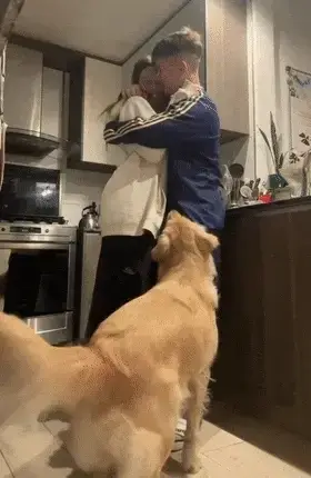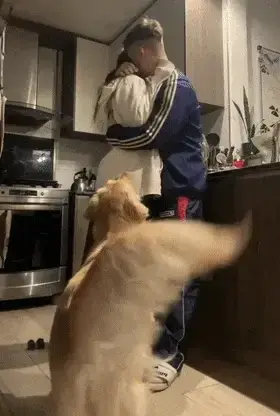 자신을 빼놓고 둘만 다정하게 있는 꼴을 볼 수 없는 골든 리트리버의 순수한 질투심이 너무 귀엽습니다. 자신이 주인에게 가장 사랑받는 존재여야 한다는 강한 애착과 소유욕이 느껴집니다!
