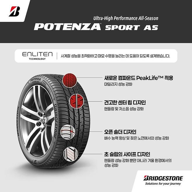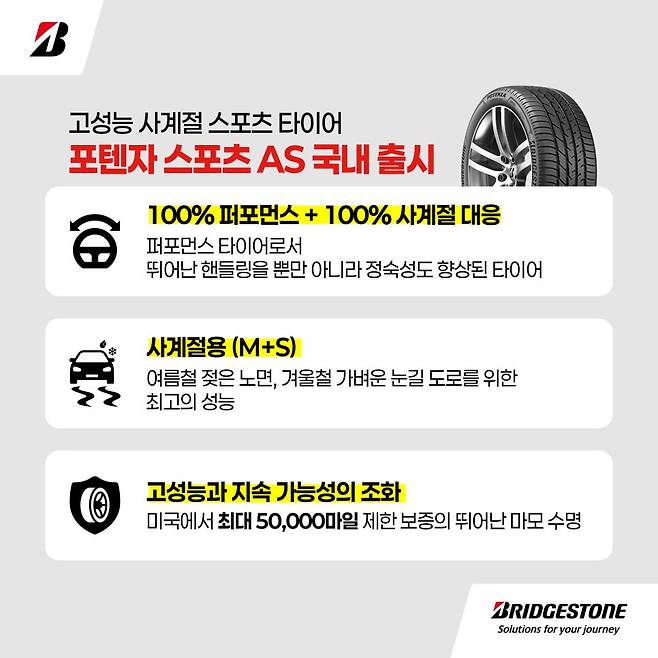 브리지스톤 타이어 세일즈 코리아(이하 브리지스톤)가 고성능 사계절 스포츠 타이어 ‘포텐자 스포츠 AS(AS는 ‘All Season’의 약자)’를 국내 시장에 공식 출시한다고 밝혔다.