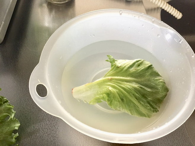 여기에 시든 상추를 단 2~10분 담가두면 열충격 효과로 세포의 조직이 활짝 열리며 빠르게 수분을 흡수합니다.