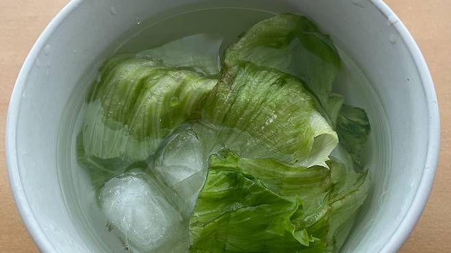 얼음물 혹은 차가운 물을 넉넉히 받아, 상추를 5~30분간 담가둡니다.