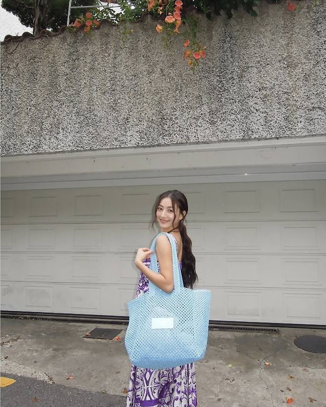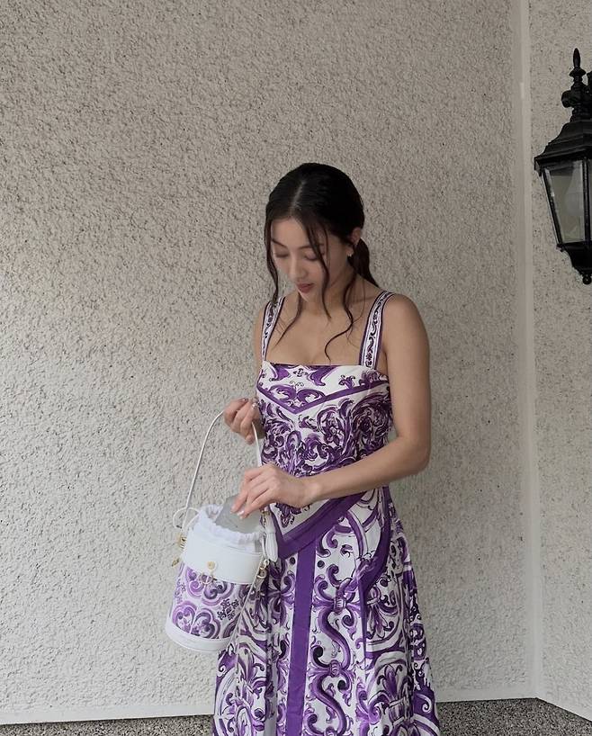 화려한 보라 패턴의 뷔스티에 드레스는 지효의 조각 같은 얼굴과 대비를 이루며 독보적인 고급미를 자아냈고, 통일감 있게 매치된 버킷백과 실버 이어링이 룩에 생기를 더했습니다.