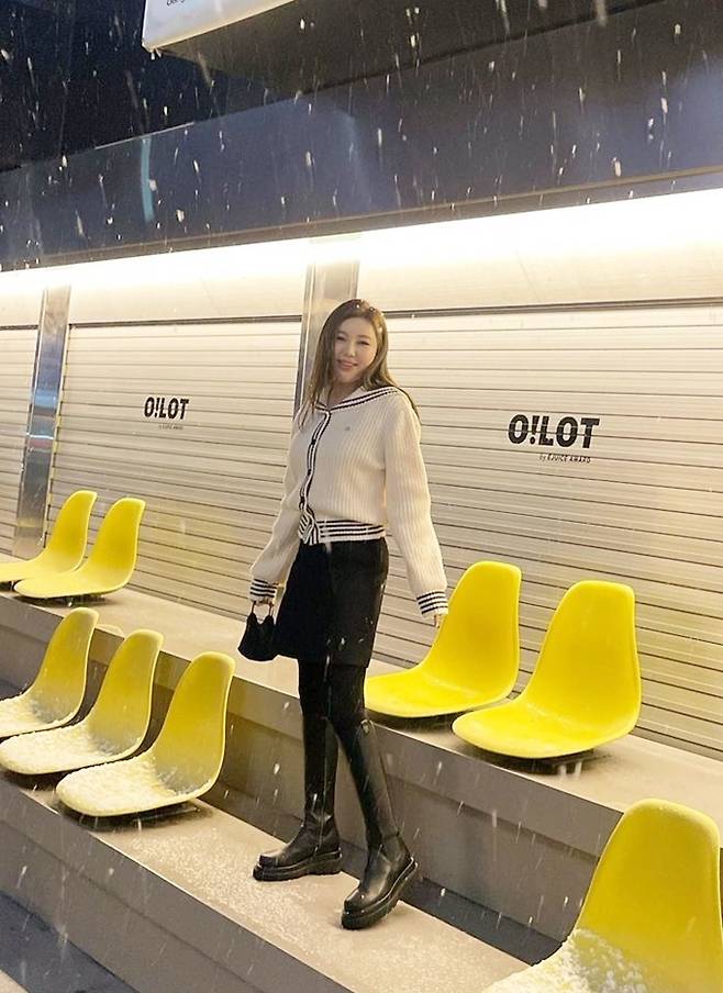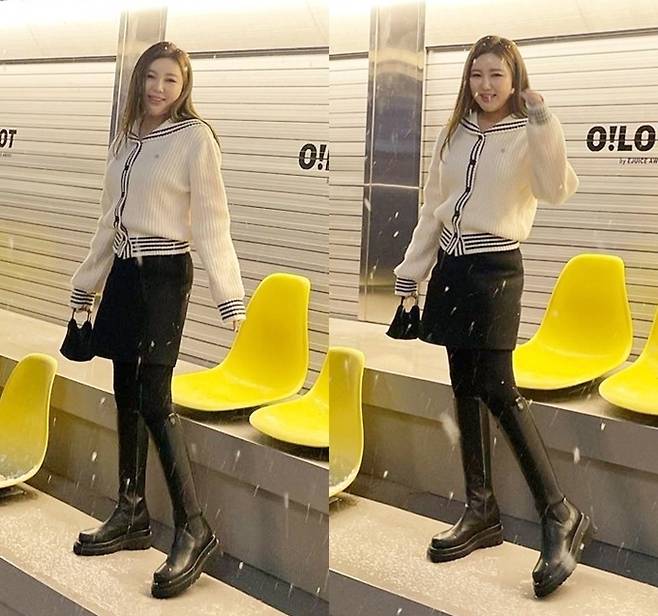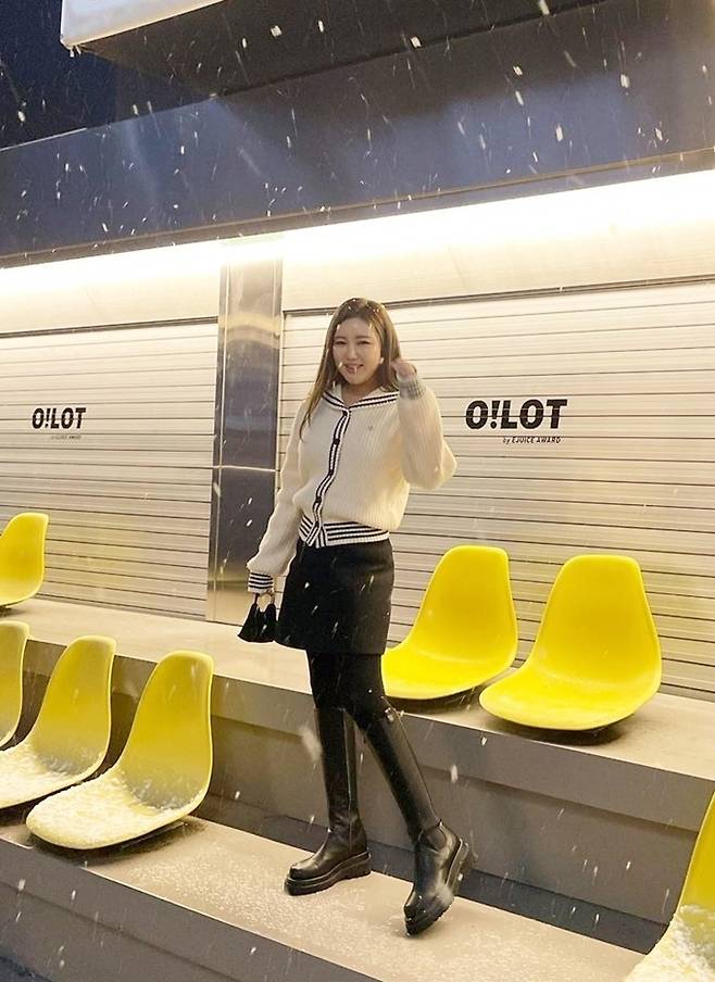 가수 송가인이 첫 눈 온날 미니에 롱부츠룩으로 소녀 감성을 그대로 드러냈다.