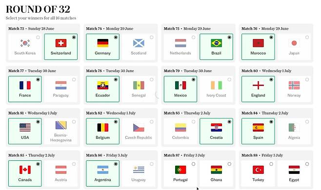 토너먼트 대진표상, A조 2위는 B조 2위를 상대하게 된다. 캐러거는 A조 2위 한국과 B조 2위 스위스가 북중미 월드컵 32강에서 격돌할 것으로 예상했다.