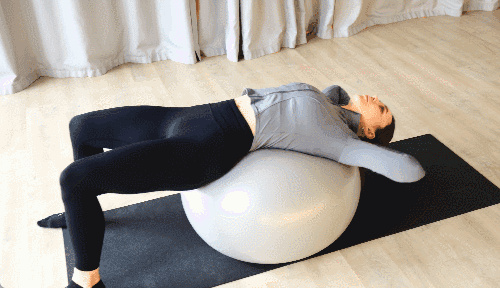 짐볼 위에 등을 대고 누운 상태에서 손을 머리 뒤로 가볍게 댑니다. 발은 어깨너비로 벌려 바닥에 단단히 고정해 균형을 유지하세요. 복부에 힘을 주며 상체를 들어 올렸다가, 복부 긴장을 유지한 채 다시 내려옵니다. 이 동작을 반복합니다.
