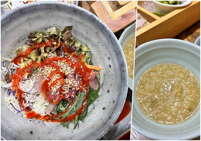 죽 종류는 사실 어느 횟집에서나 내오는데, 이곳의 죽은 진하게 끓인 전복죽이다. 활어회를 먹기 전 입맛을 돋우기 충분하다. 그리고 회덮밥. 회덮밥은 사실 제주도의 횟집에서도 스끼다시로 자주 본 적은 없는데, 1인분 정도의 분량으로 한 그릇을 내왔다. 잘 비빈 후 원하는 만큼씩 적당히 먹으면 된다.