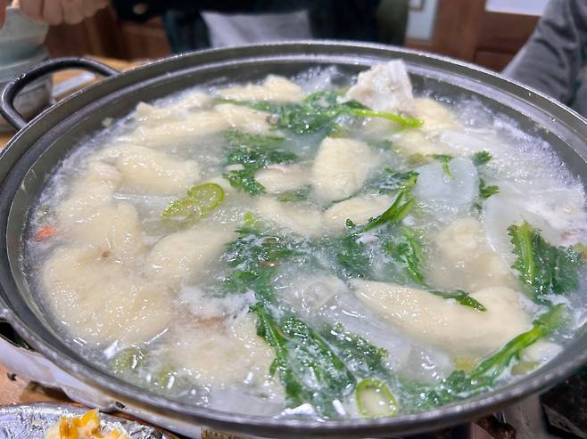 메인 회의 접시가 조금씩 빈 틈을 보이기 시작하면 조리된 음식이 하나둘씩 등장한다. 이미 익숙한 콘 버터구이를 비롯해 주로 제주도의 횟집에서만 맛볼 수 있는 전복구이와 새우구이, 옥돔구이 등이다. 이게 마지막인가 싶지만 아직 하나가 더 남았다. 지리탕이다. 서울에선 주로 고춧가루와 야채가 듬뿍 들어간 매운탕을 내오지만 제주도민들은 지리탕을 주로 먹는다. 나 역시 고춧가루 범벅의 매운탕에 익숙할 땐 잘 몰랐었는데 제주도에서 늘 지리탕을 먹다보니 담백하고 깔끔한 맛에 반해 시뻘건 매운탕은 거의 찾지 않게 됐다. 지리탕에 수제비를 넣는 곳도 있고, 그렇지 않은 곳도 있는데, 이곳은 수제비를 듬뿍 넣어 내왔다. 수제비가 가득한 지리탕, 이걸 다 먹을 수 있을까?