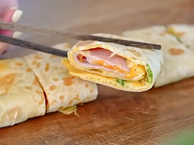 바쁜 아침, 단 5분 만에 만들 수 있는 대파 계란 또띠아 랩은 한 끼 식사로 손색이 없다. 대파 달걀을 부쳐서 그 위에 또띠아를 붙이고 햄과 치즈를 넣어 돌돌 말아주면 끝! 따로 복잡한 준비가 필요 없으면서도 아침을 든든하게 채워줄 수 있다.