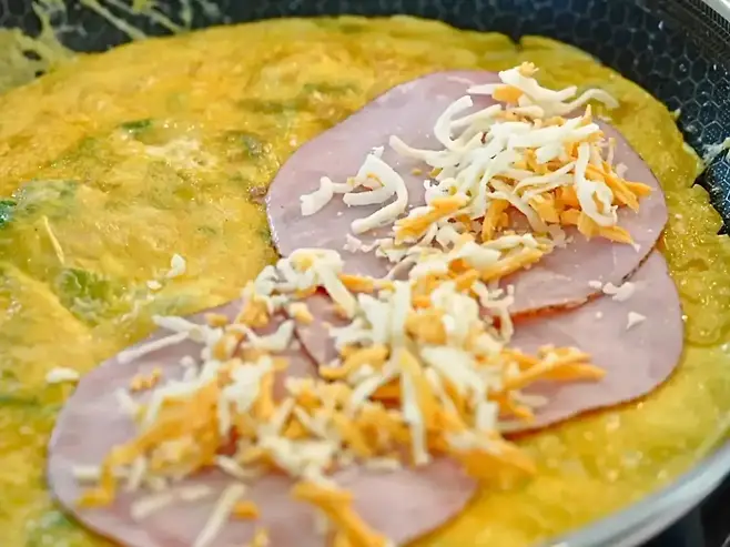 3. 뒤집어 달걀 면을 위로 올리고, 한쪽에 햄과 치즈를 올린다.