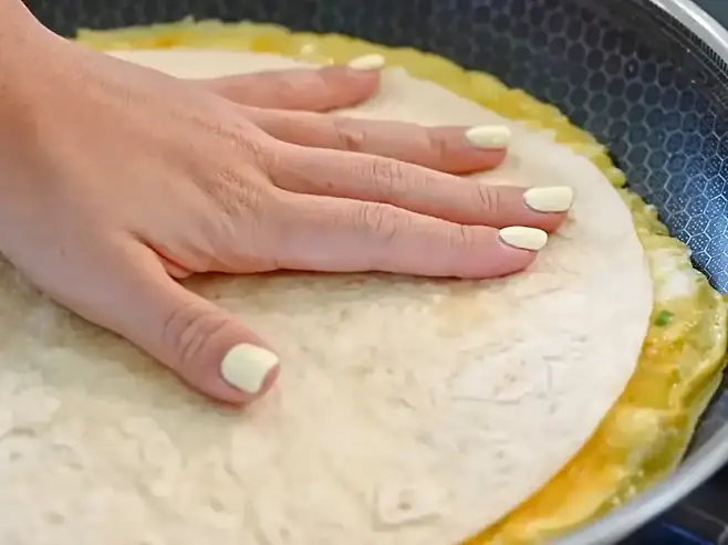 2. 팬에 기름을 두르고 달걀물을 붓고 얇게 펼친다. 바닥이 살짝 익었을 때 또띠아를 올려 달걀과 붙도록 누른다.