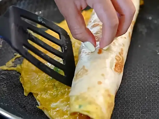 4. 또띠아를 반으로 접거나 돌돌 말아 가장자리를 팬에 살짝 눌러 고정한다.