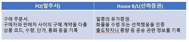 한편 B/L은 포워더에게 운송을 의뢰한 뒤 받을 수 있는 일종의 유가증권이다. PO가 상품 종류나 사양, 수량, 가격 등 제품 정보를 주로 담고 있다면, B/L은 출도착지와 컨테이너 수, 중량과 같은 운송 관련 정보를 주로 담고 있다. 따라서 운송과 관련된 일은 B/L을 기반으로 관리한다.