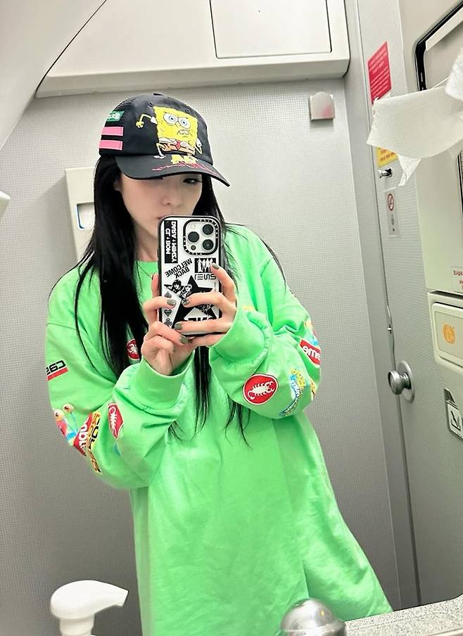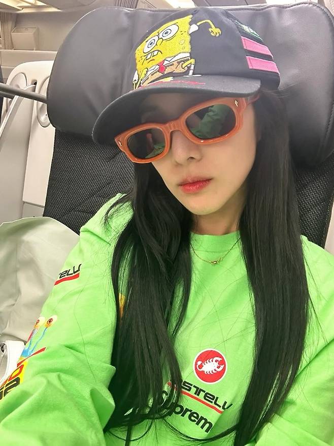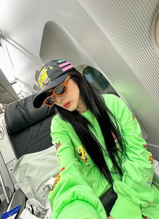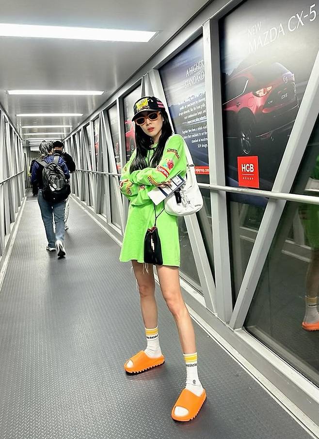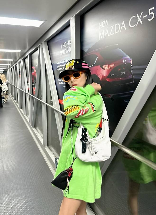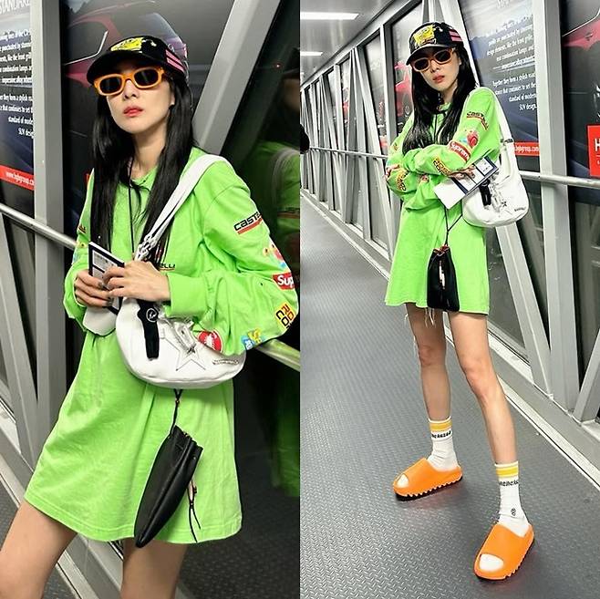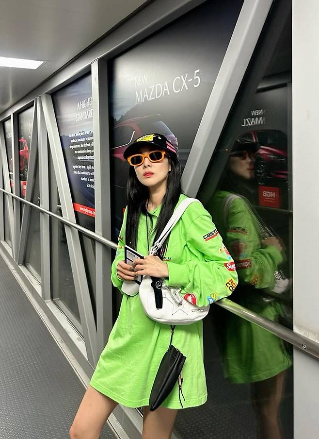 공개한 사진에서 산다라박은 형광 그린 컬러의 오버사이즈 티셔츠를 원피스처럼 연출해 상큼하면서도 개성 넘치는 공항룩을 완성했다.