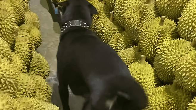 햇살 가득한 어느 오후, 일꾼들이 분주히 과일을 상자에 담고 있었습니다. 노랗고 탐스러운 두리안들이 조심스레 포장되어 두 개의 작은 산처럼 쌓였고, 그 사이에는 좁은 틈이 하나 남아 있었죠. 그때 호기심 많은 작은 강아지가 그 틈새로 들어가 보기로 했습니다.