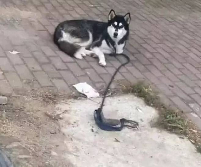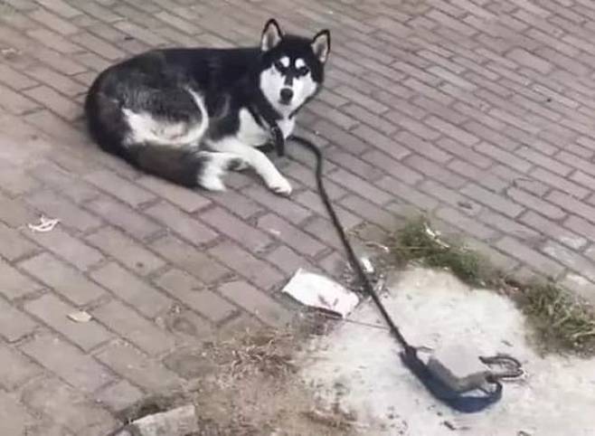 보면 볼수록 두 눈을 의심하게 만드는 광경이 실제로 벌어졌습니다. 아니 글쎄 목줄에 벽돌 하나 올려놨을 뿐인데 강아지가 차분히 앉아 집사를 기다리고 있는 것이었죠.